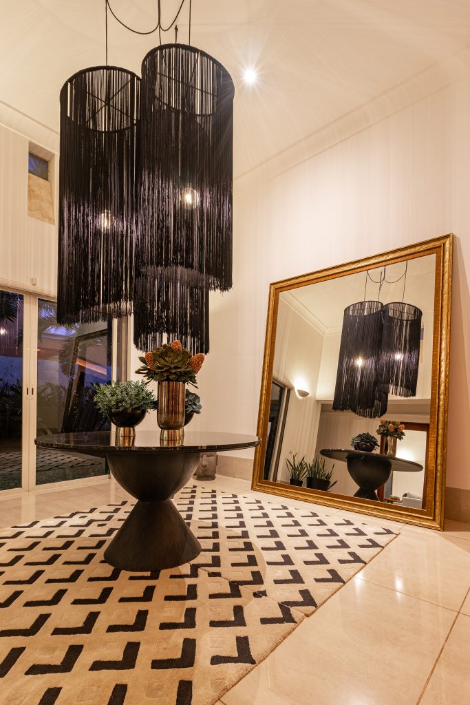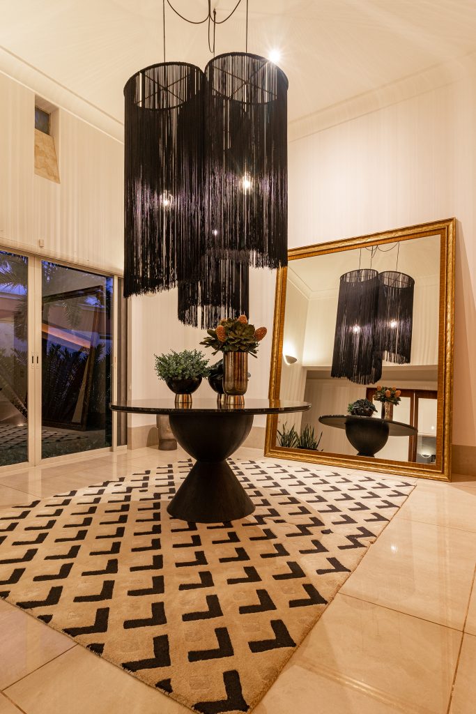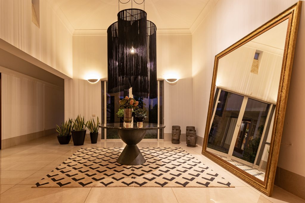 Con la finalidad de darle otra vista –imponente- al vestíbulo, se diseñó una mesa proporcional para el espacio, dando el toque elegante con una cubierta de mármol vía láctea brillado y una base de encino en color negro, la calidez se genera con las lámparas de flecos de diferentes alturas que dejan pasar la luz, y el espacio se enmarca con un tapete que unifica los tonos de muros con mobiliario.